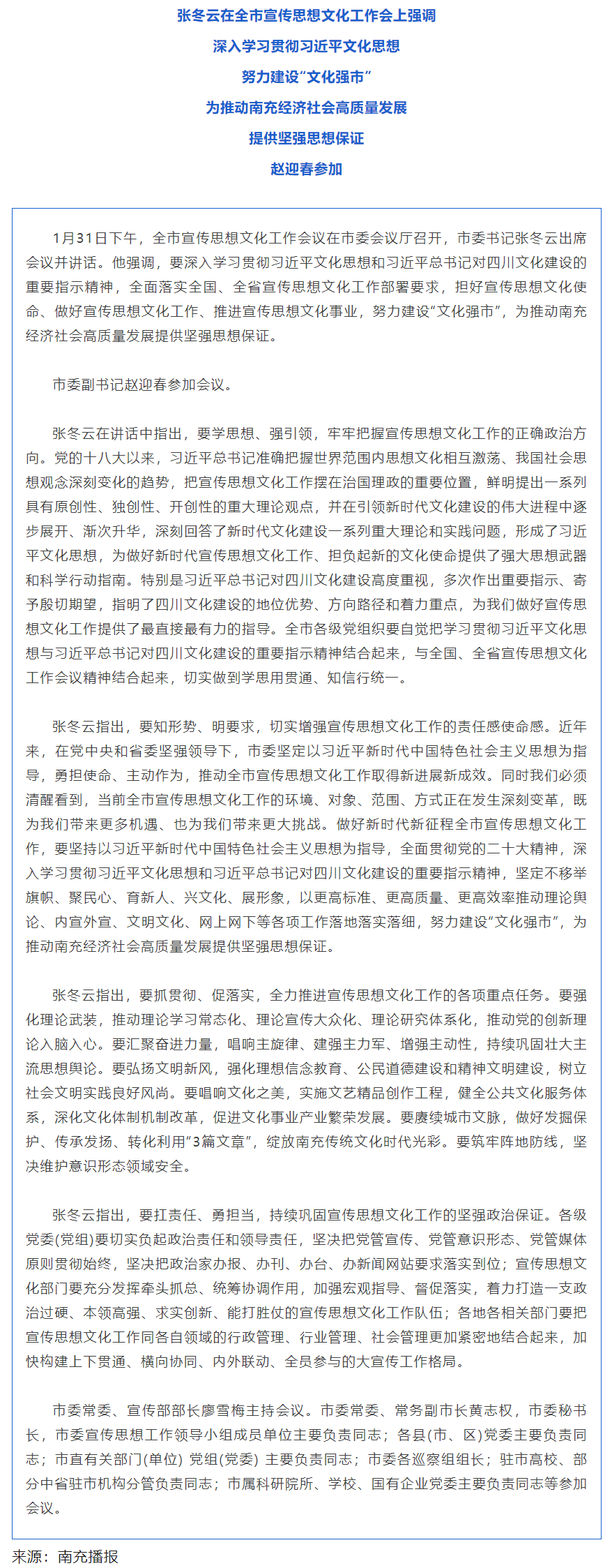 張冬云:深入學(xué)習(xí)貫徹習(xí)近平文化思想 努力建設(shè)“文化強市” 為推動南充經(jīng)濟社會高質(zhì)量發(fā)展提供堅強思想保證
