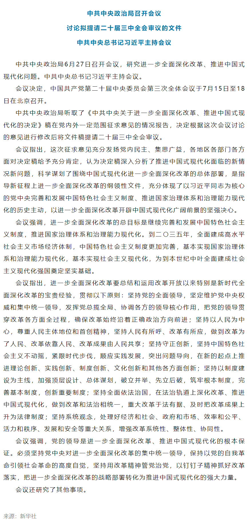 黨的二十屆三中全會將于7月15日至18日在京召開