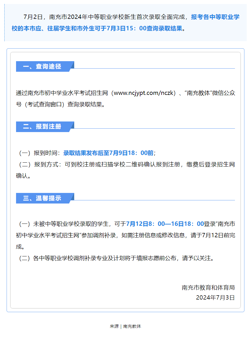 2024年南充市中等職業(yè)學(xué)校首次錄取結(jié)果查詢公告