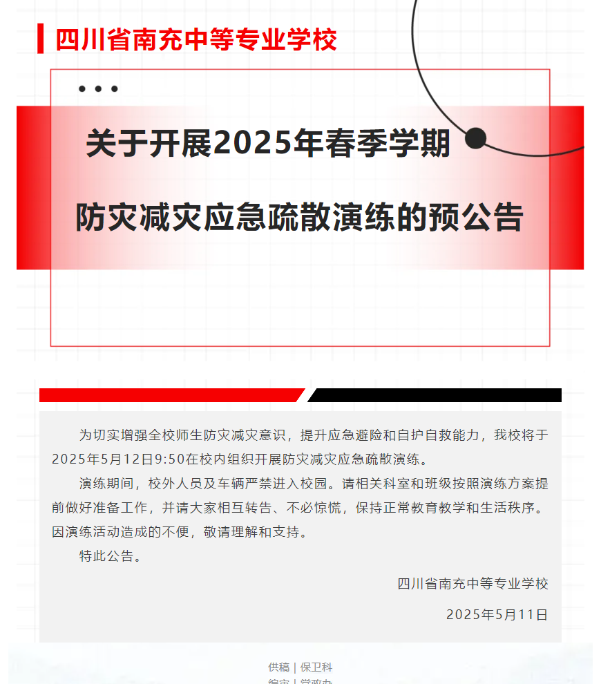 四川省南充中等專業(yè)學(xué)校關(guān)于開展2025年春季學(xué)期防災(zāi)減災(zāi)應(yīng)急疏散演練的預(yù)公告