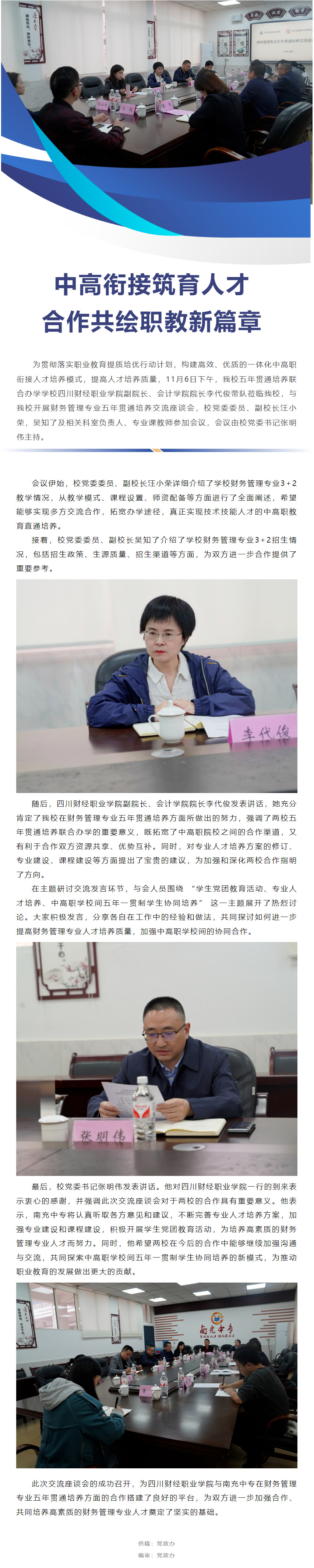 中高銜接筑育人才,合作共繪職教新篇——四川財(cái)經(jīng)職業(yè)學(xué)院與南充中專舉行財(cái)務(wù)管理專業(yè)五年貫通培養(yǎng)交流座談會(huì)