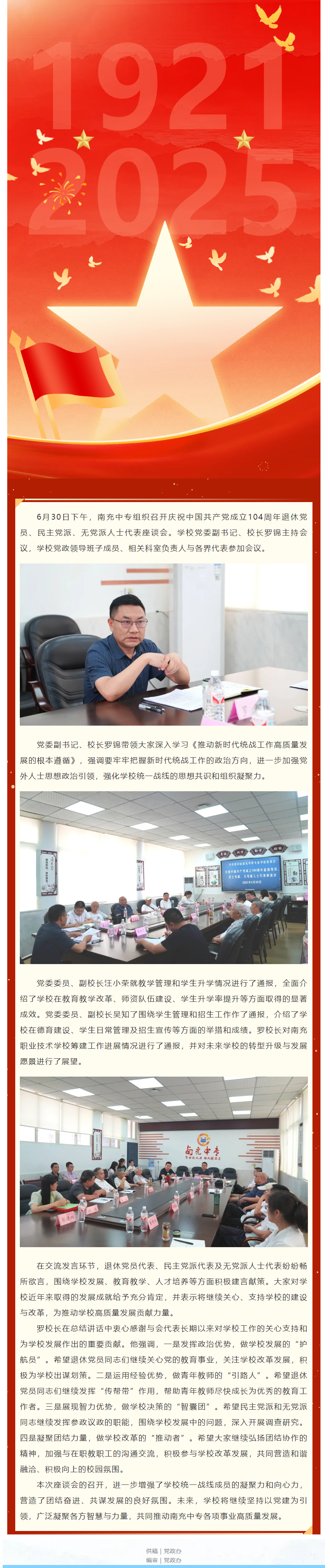 南充中專召開慶祝中國(guó)共產(chǎn)黨成立104周年退休黨員、民主黨派、無黨派人士代表座談會(huì)